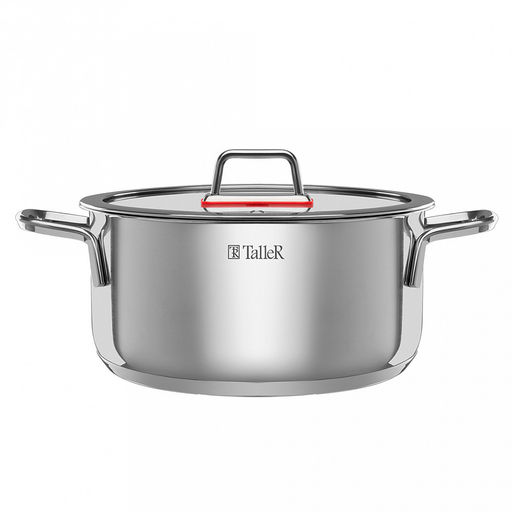 Кастрюля из нержавеющей стали "Tendency" 6,8л, д26см, h13,5см, s0,6мм, дно s2,8мм, плоская стеклянная жаропрочная крышка, пароотвод, стальной обод, капсулированное дно, прутковые ручки из нержавеющей стали на точечной сварке, полировка снаружи - зерк