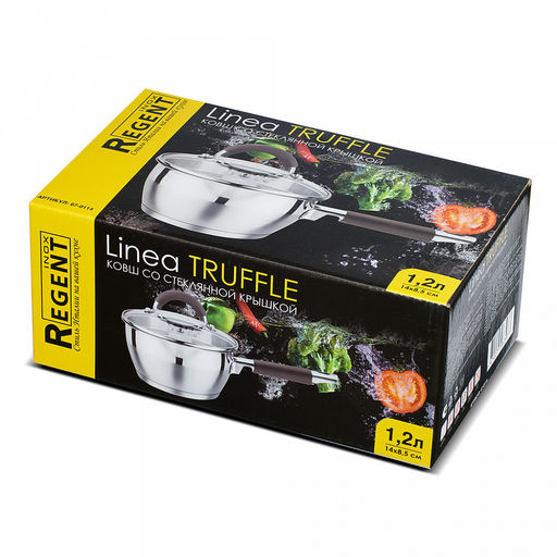 Ковш из нержавеющей стали "Truffle" 1,1л, д14см, h8,5см, s3мм, дно s0,5мм, индукционное дно д10,5см, стеклянная крышка с силиконовой вставкой, ручка из нержавеющей стали с силиконовой вставкой, многослойное капсулированное дно, мерная шкала, цветная