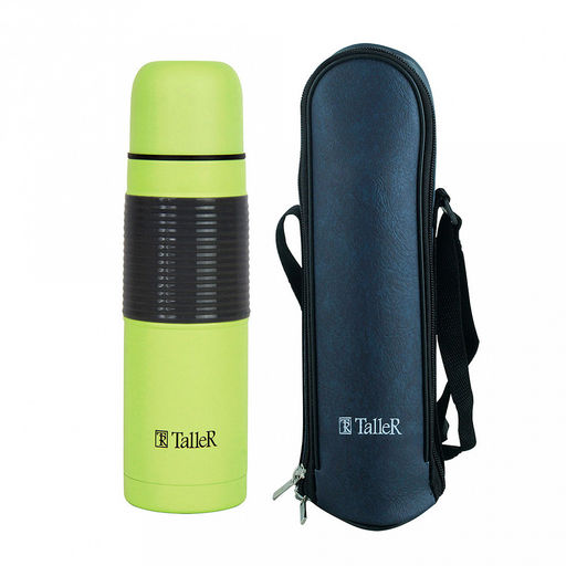 Термос из нержавеющей стали с узкой горловиной 0,5л "Лестер" д6,9см, h24,6см, горло д4,4см, кнопочный механизм, узкое горлышко, автостоппер, защита от проливания, завинчивающаяся крышка-стакан, силиконовый протектор, покрытие - салатовый глянец, чехо