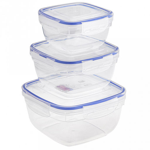 Контейнер для продуктов пластмассовый набор 3шт: 0,5л - 12х12х6,5см, 0,9л - 14,3х14,3х8см, 1,5л - 17х17х9,5см, квадратный, с клипсами, воздухонепроницаемый (герметичный), съемный силиконовый уплотнитель, подходит для СВЧ (Россия)
