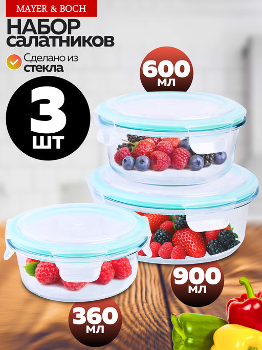 31011 Набор контейнеров с крышками из 3 шт 360/600/900мл стекло/полипр MB (х12)