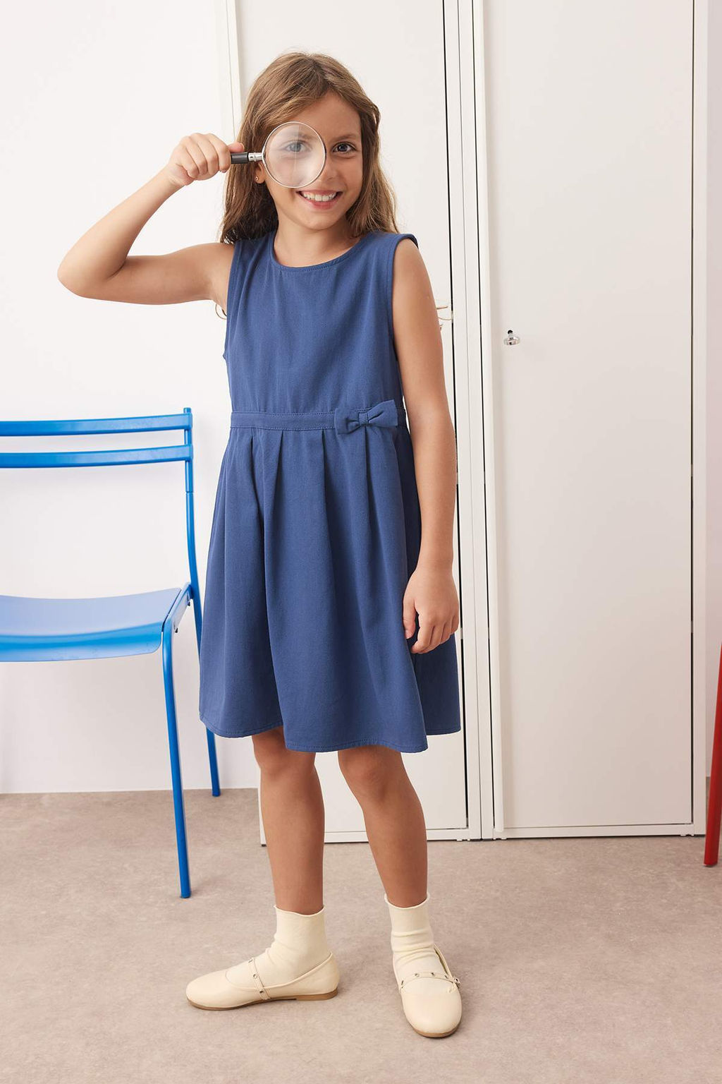 Lacivert 100% Pamuk Duz/Basic Bisiklet Yaka A-line Dokuma K?z Cocuk Okul Elbisesi TKDAW26EL00004