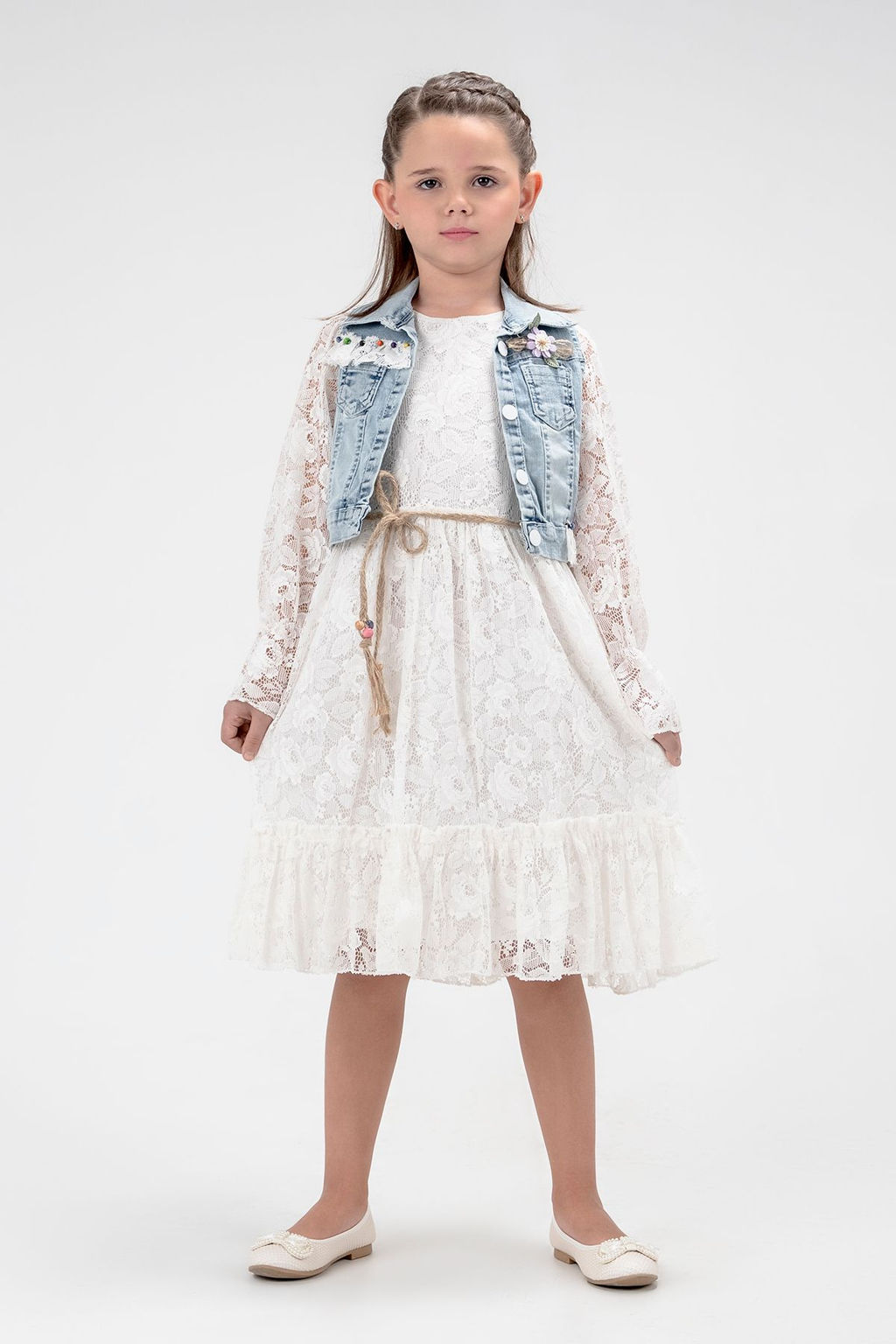 K?z Cocuk Ekru Dantel Detayl? Denim Yelek Kemerli Uzun Kollu Elbise Set Tak?m TKDSS24EL00013
