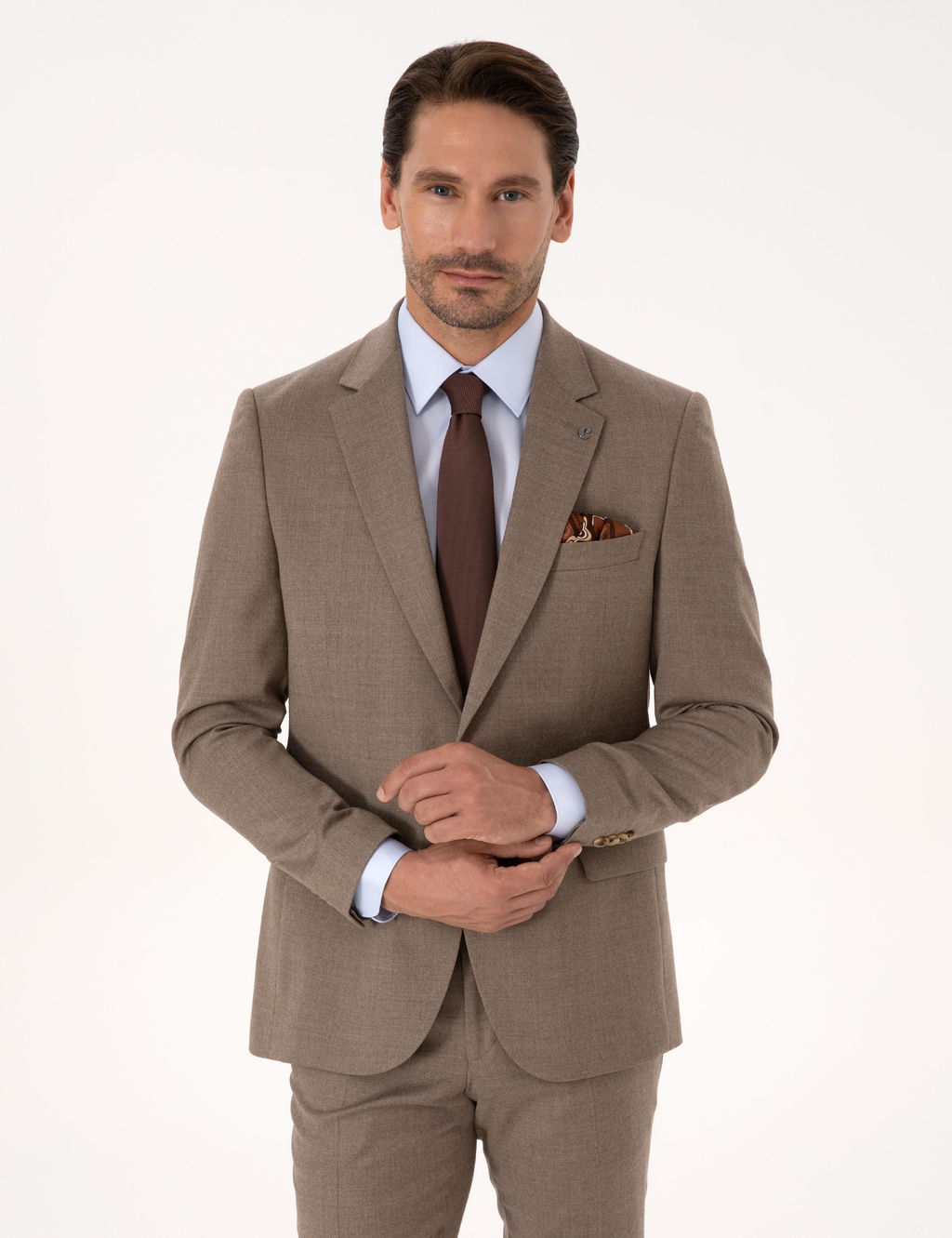 Camel Slim Fit Y_n Kar___ml_ Mikro Desenli Klasik Ceket