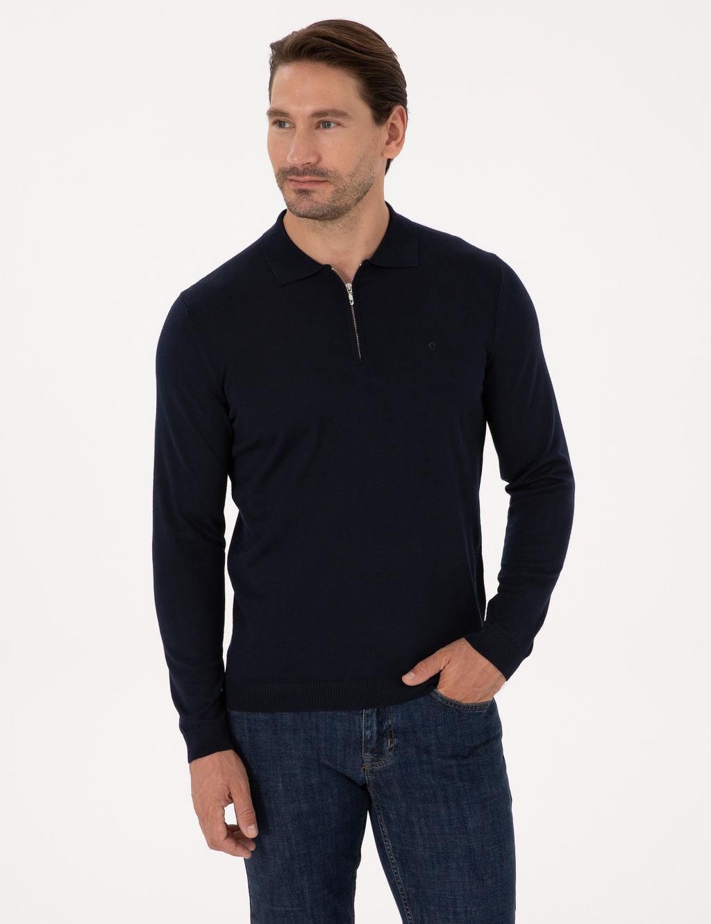 Lacivert Regular Fit Y_n Kar___ml_ Fermuarl_ Polo Yaka Basic Triko Kazak