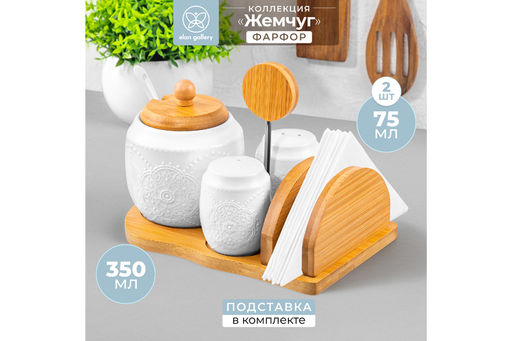 Набор - сахарница 350 мл "Жемчуг" с ложкой + солонка + перечница + салфетница на дер.подст.с ручкой
