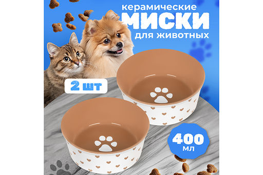 Набор 2 мисок для домашних питомцев 400 мл 13,5*13,5*5 см "Лапка на бежевом и сердечки" керамика