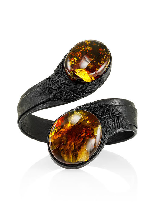 Жёсткий браслет Змейка из кожи с мерцающим вишнёвым янтарём
