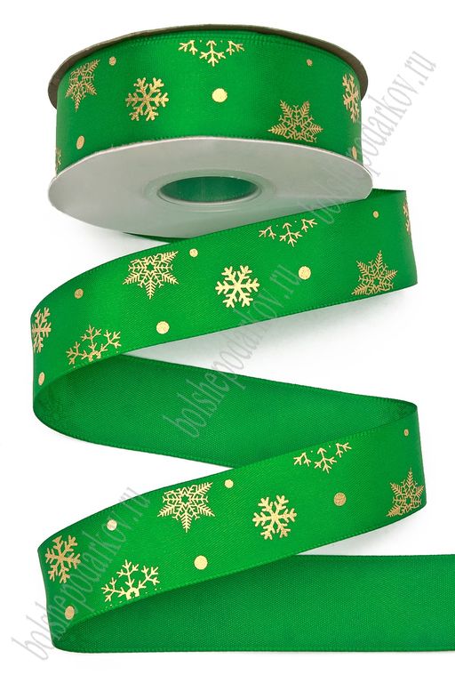 Лента атласная 2,5 см*20 ярд "Снежинки" SF-7328, зеленый/золото №076