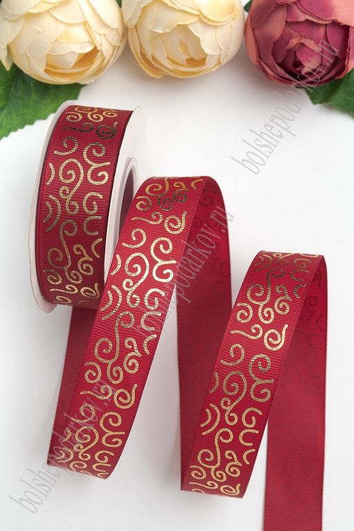 Лента репсовая 2,5 см*20 ярд "Узор" SF-5852, бордовый/золото №37