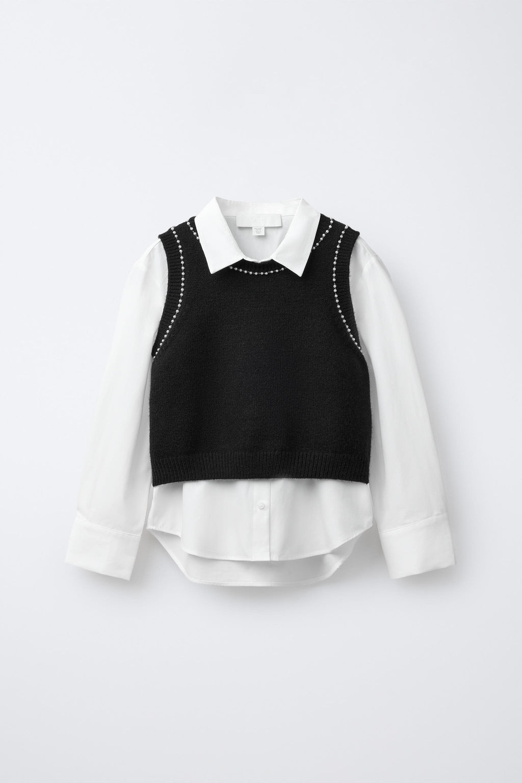 PLAIN SHIRT WITH KNIT WAISTCOAT AND FAUX PEARLS