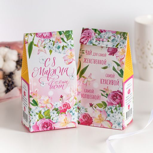 Подарочный чай-домик "С 8 марта, с днём весны (цветы на светло-розовом)"