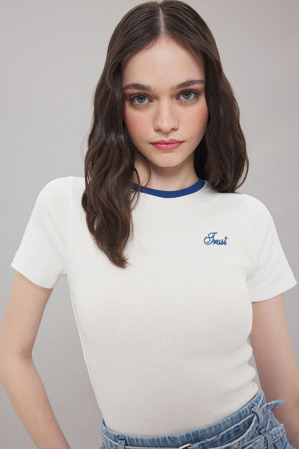 Ekru Slogan Nak?sl? Kontrast Biye Detayl? Regular Boy Fitilli Esnek Orme Bluz TWOSS25BZ00372