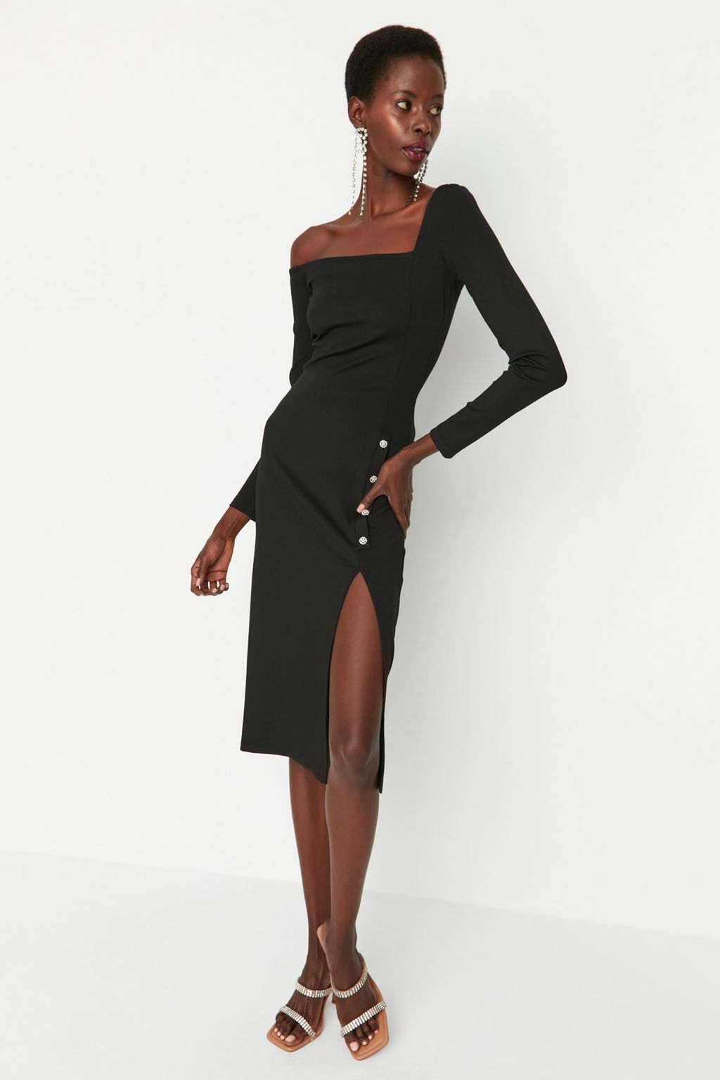 Siyah Tas Dugme Detayl? Orme S?k Abiye Elbise TPRAW23EL00268