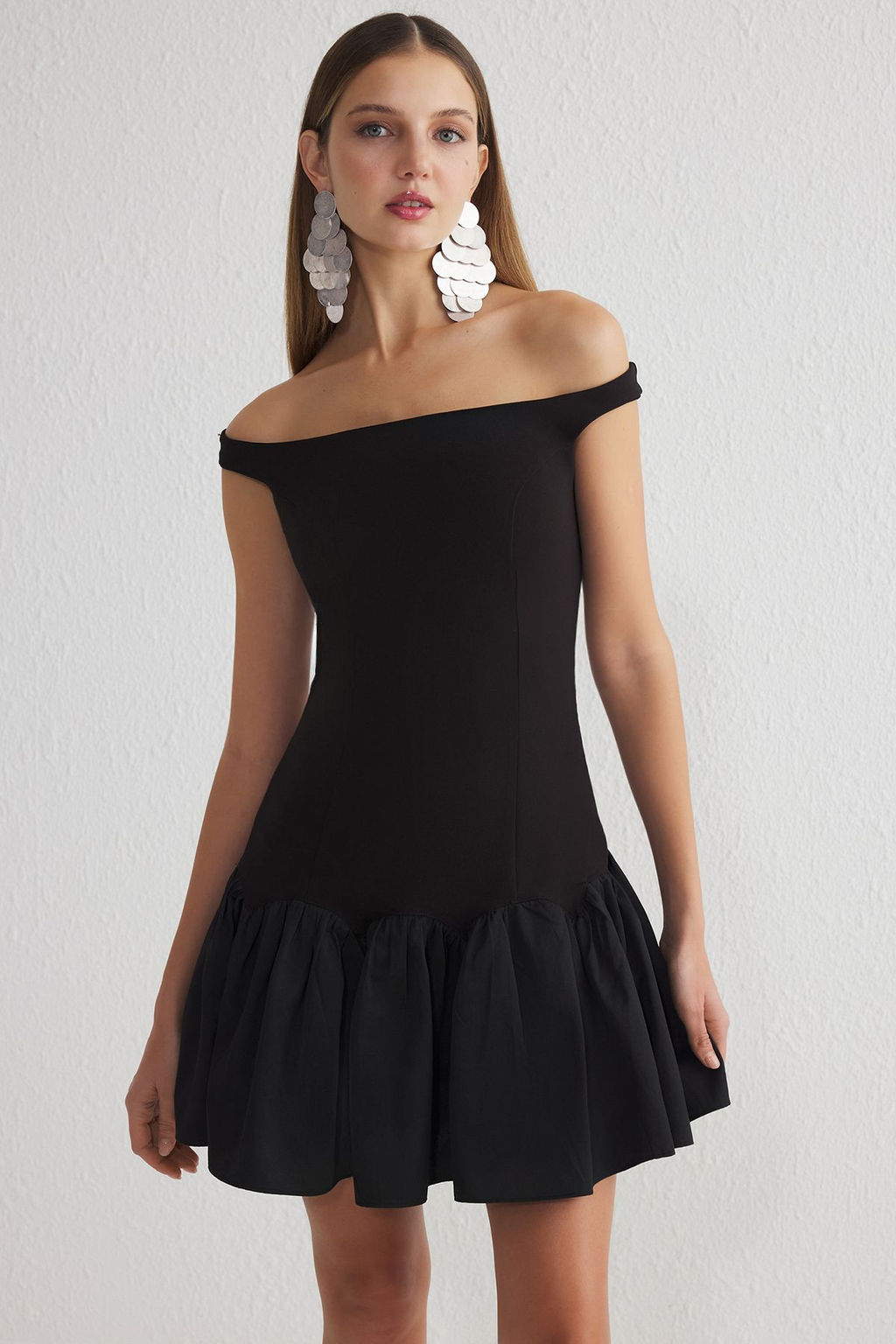 Siyah A-Kesim Carmen Yaka Dokuma K?sa Abiye Gece Mezuniyet Elbisesi TPRSS25EL00139