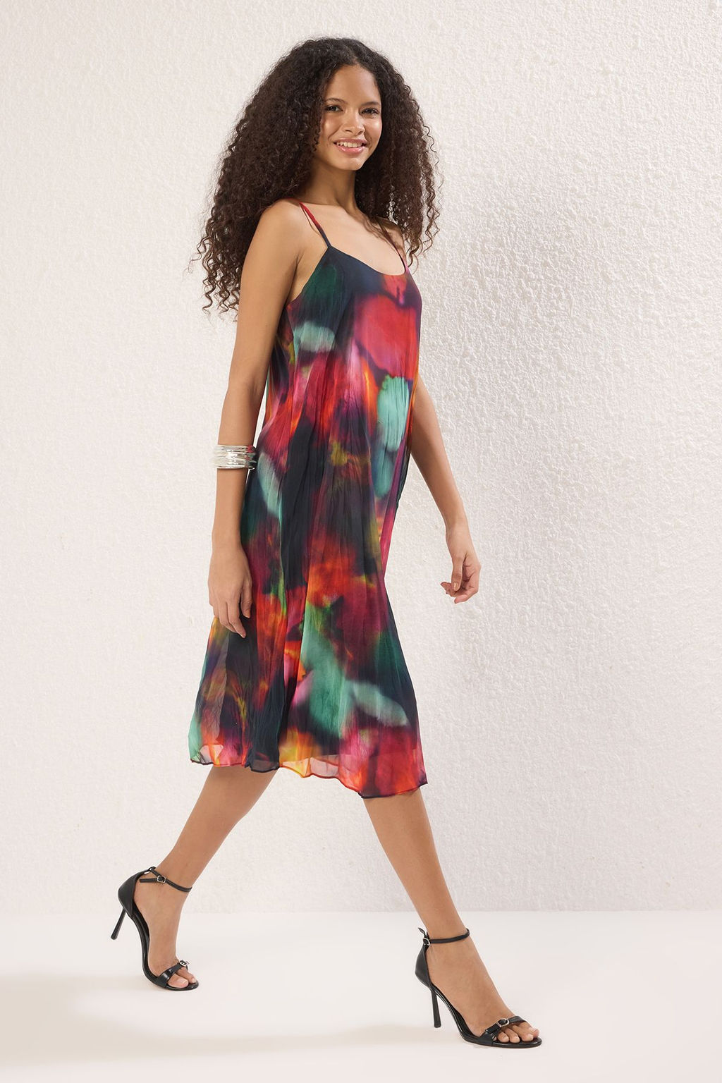 Cok Renkli Duz Kesim Soyut Desenli Midi Dokuma Sifon Astarl? Elbise TWOSS25EL00806
