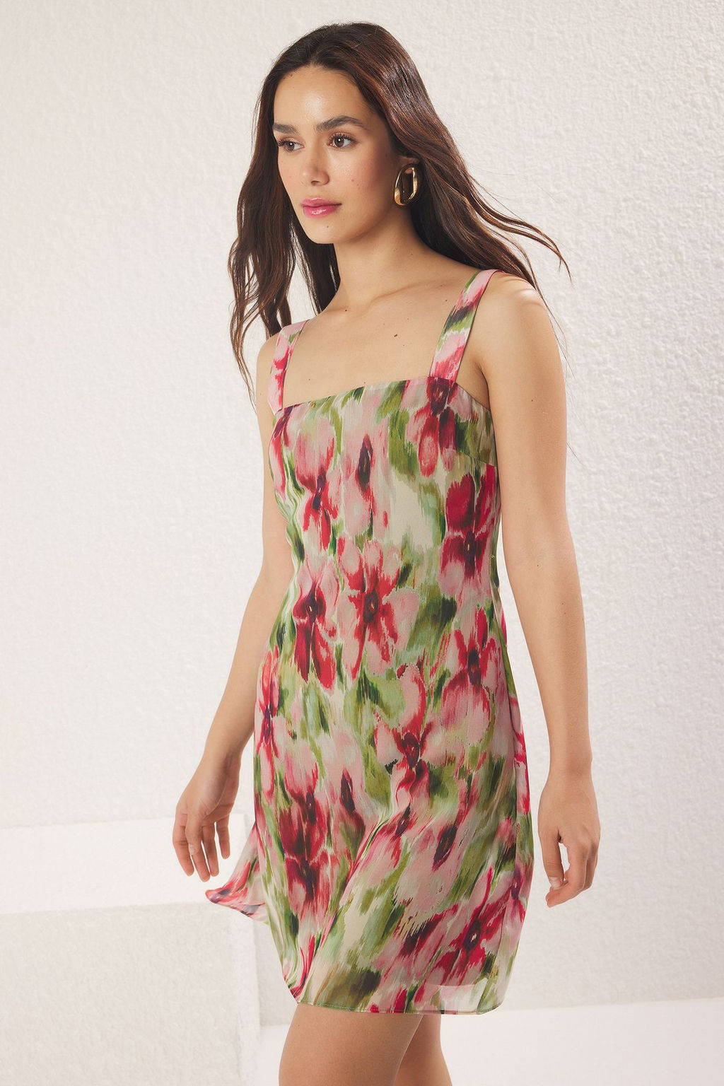 Cok Renkli Soyut A Kesim F?rf?rl? Sifon Ucus Ucus Dokuma Mini Elbise TWOSS25EL00567