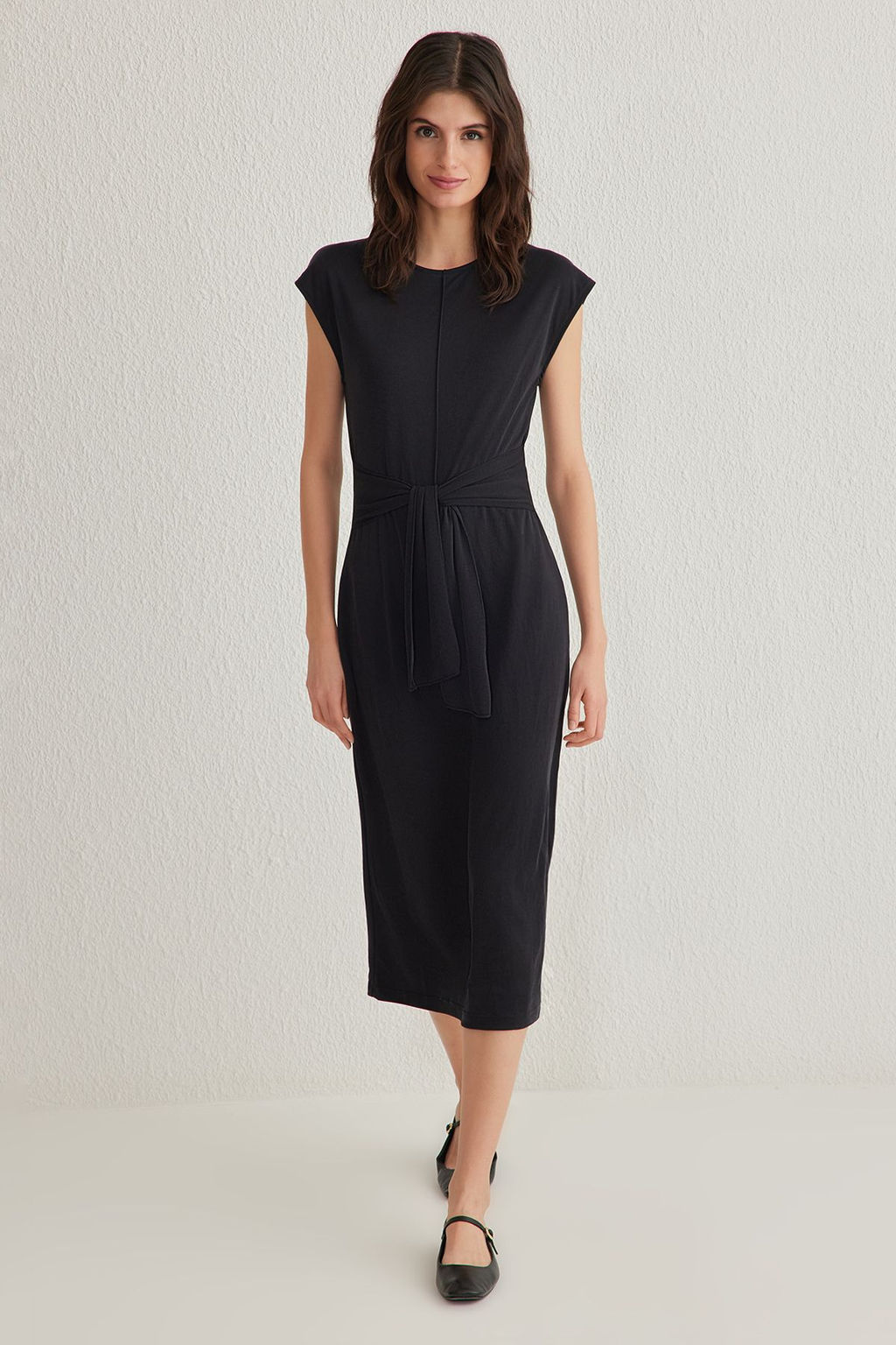 Siyah Duz Kusakl? Midi Yumusak Dokulu Modal Pike Orme Elbise TWOSS25EL00072
