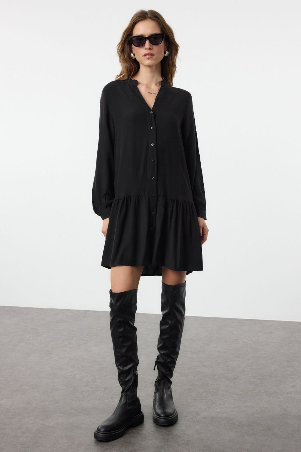 Siyah Mini Kal?n Viskon Dokuma Gomlek Elbise TWOAW25EL00571