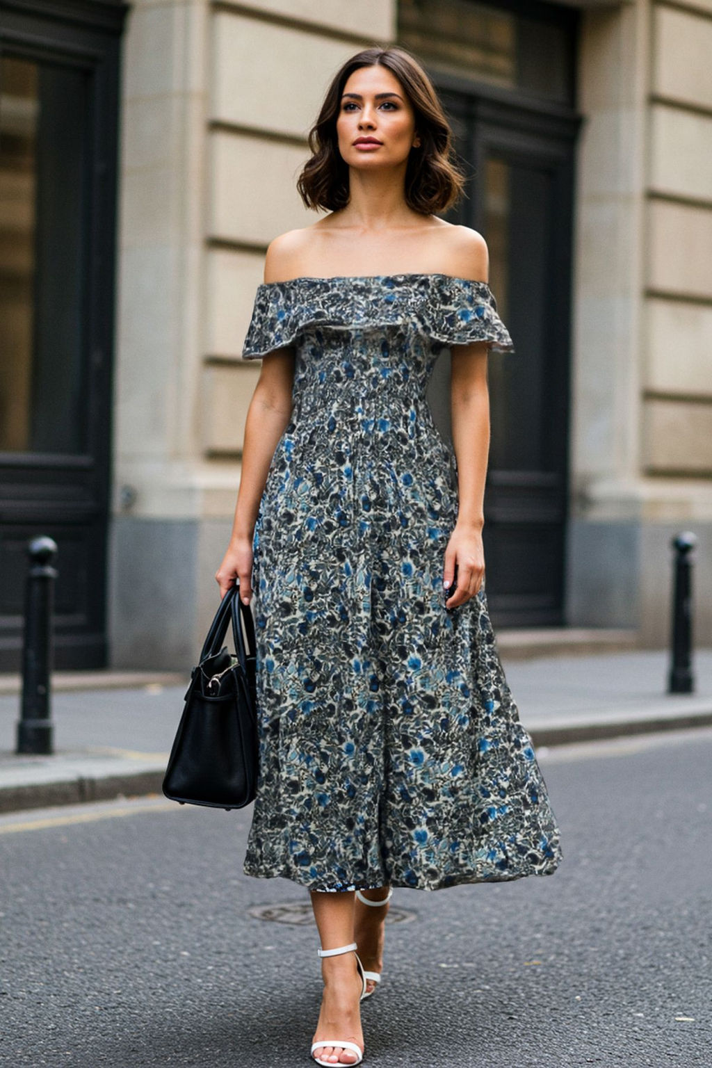 Mavi Cicekli Carmen Yaka A Line/Can Kesim Midi Orme Elbise TWOSS25EL00544