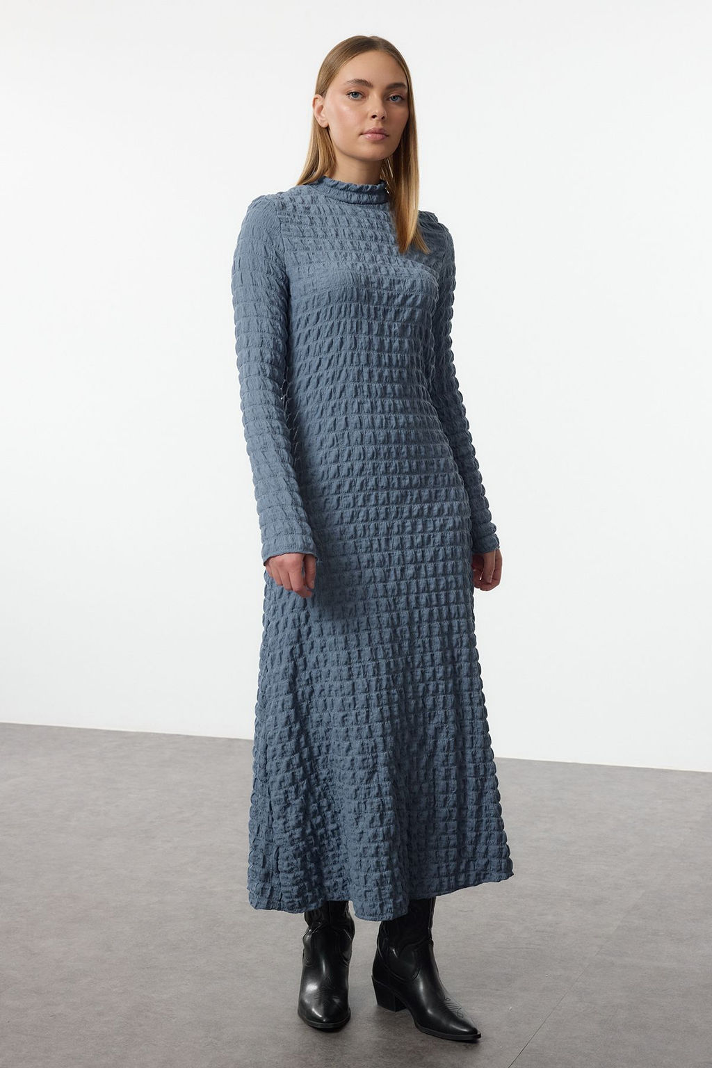 Indigo Duz Dokulu Dik Yaka A-Line Esnek Maxi Orme Elbise TWOAW25EL00197