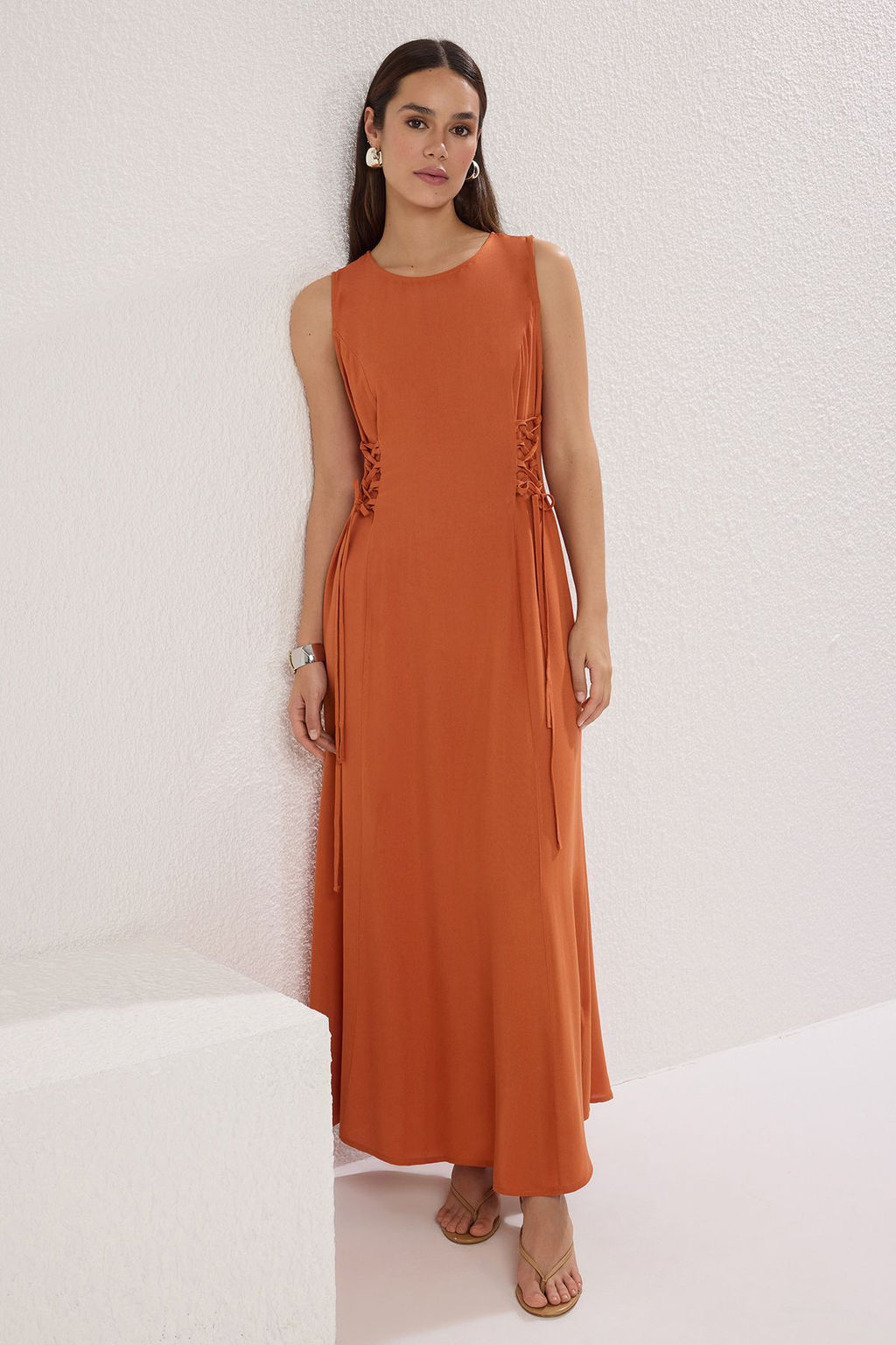 Kahverengi Duz A Kesim Kusgozu Detayl? Maxi Dokuma Elbise TWOSS25EL00552