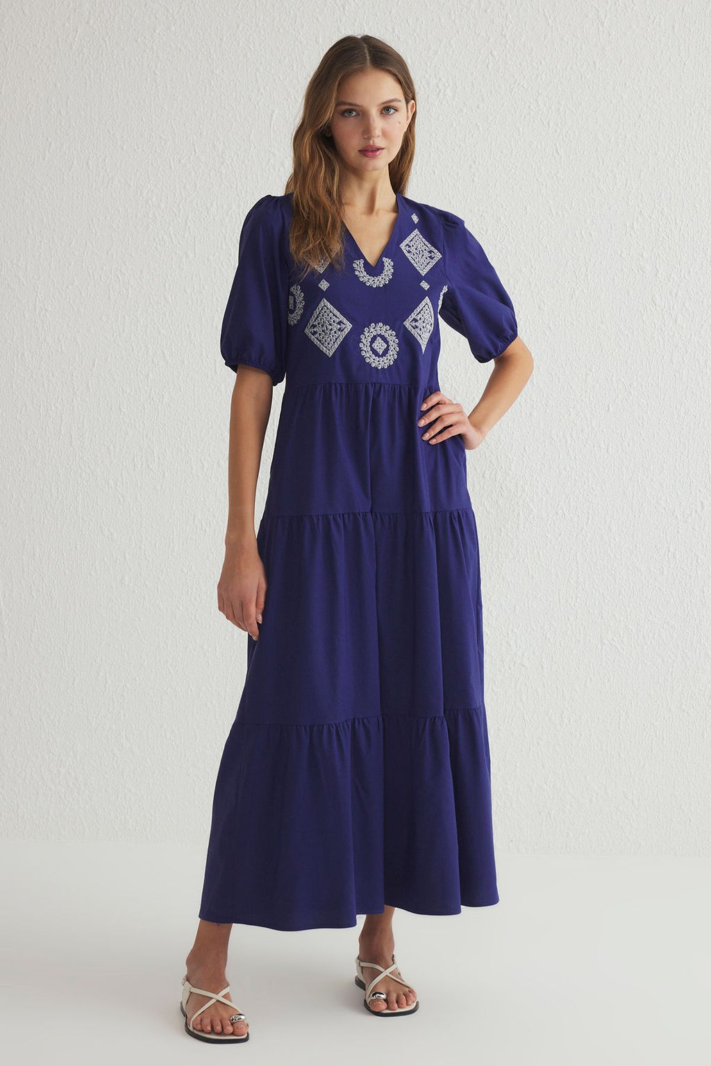 Lacivert Duz Kesim Nak?sl? Maxi Dokuma Elbise TWOSS25EL00058