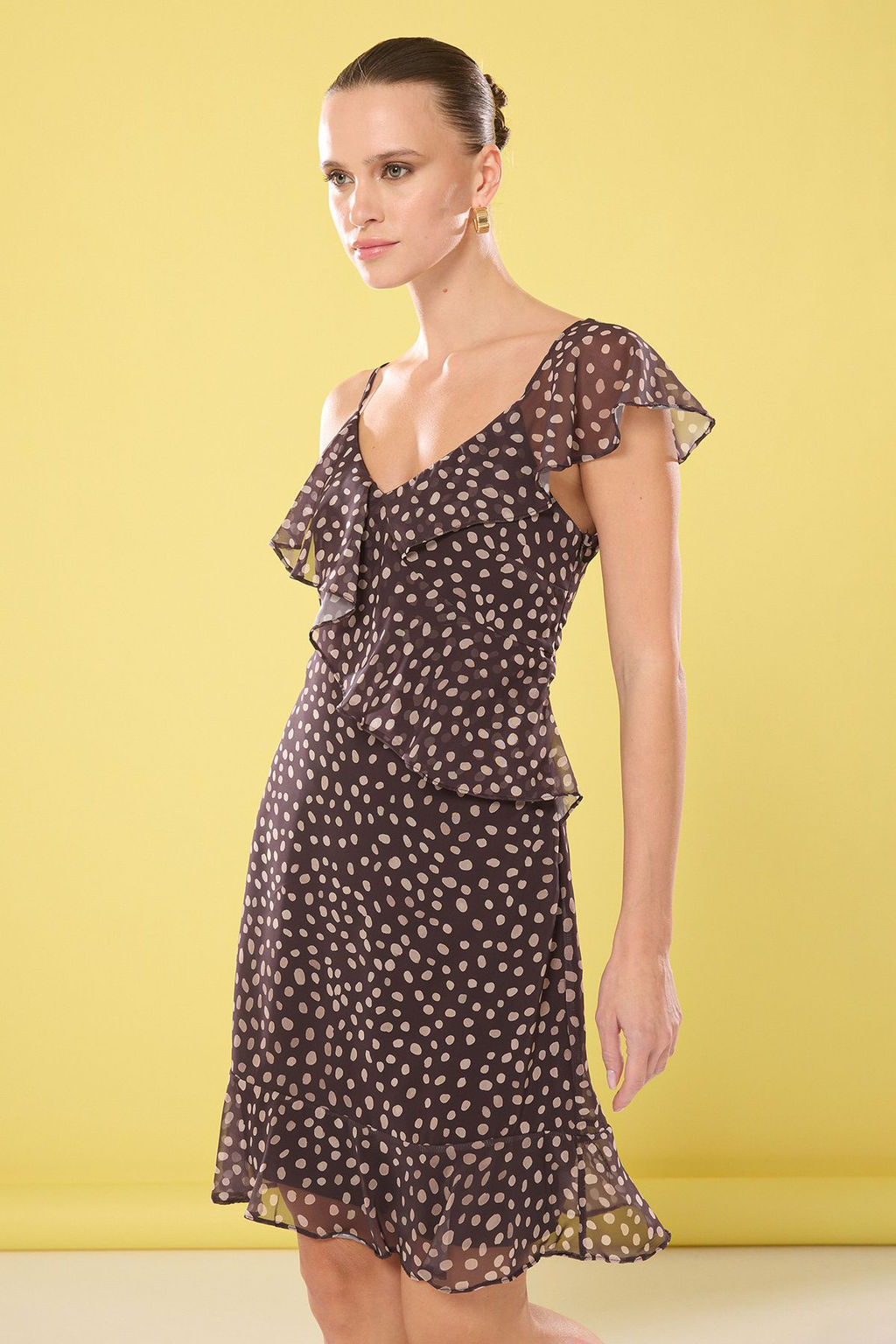 Kahverengi Puantiyeli A Kesim Volanl? Sifon Ucus Ucus Dokuma Mini Elbise TWOSS25EL00454
