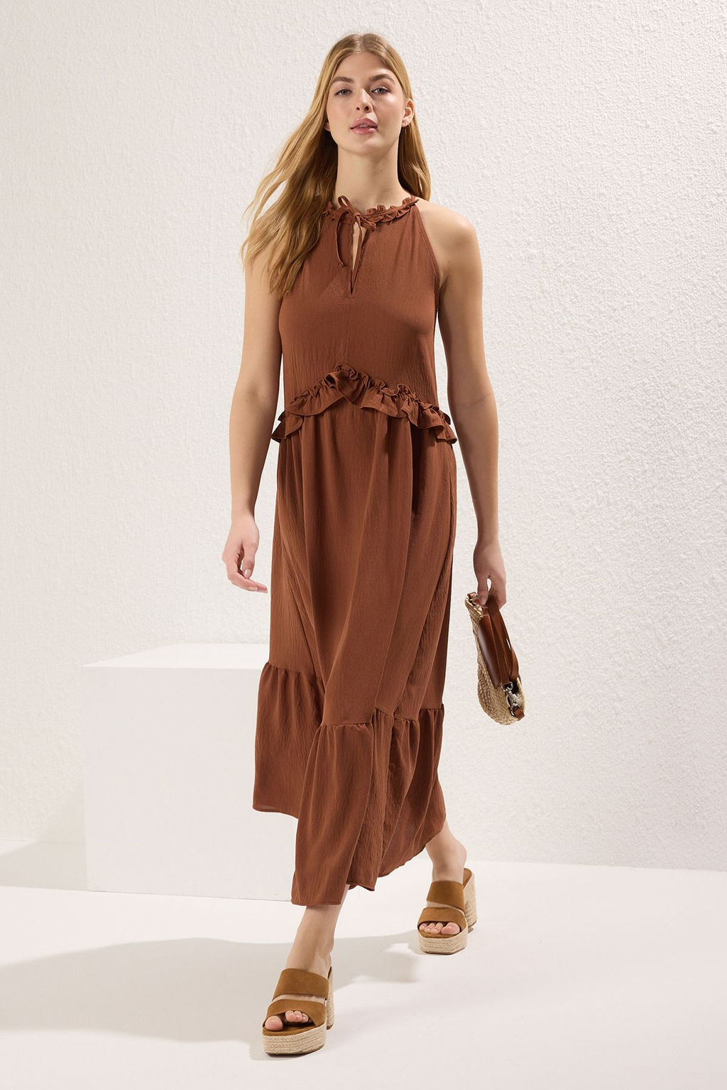 Kahverengi Duz Etegi Belden Ac?lan Volanl? / F?rf?rl? Maxi Dokuma Elbise TWOSS25EL00426