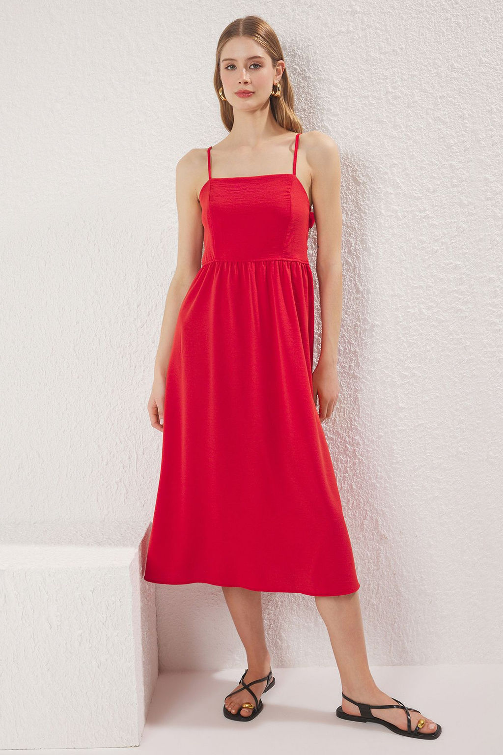 K?rm?z? Duz A Kesim Fiyonklu Midi Dokuma Elbise TWOSS25EL00559