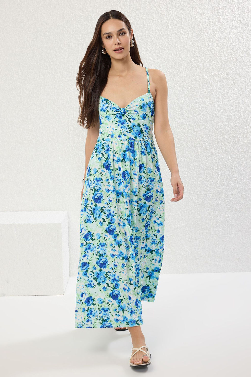 Mavi Cicek Bask?l? Ask?l? V Yaka Buzgulu Etegi Volanl? Fitilli Esnek Maxi Orme Elbise TWOSS25EL00239