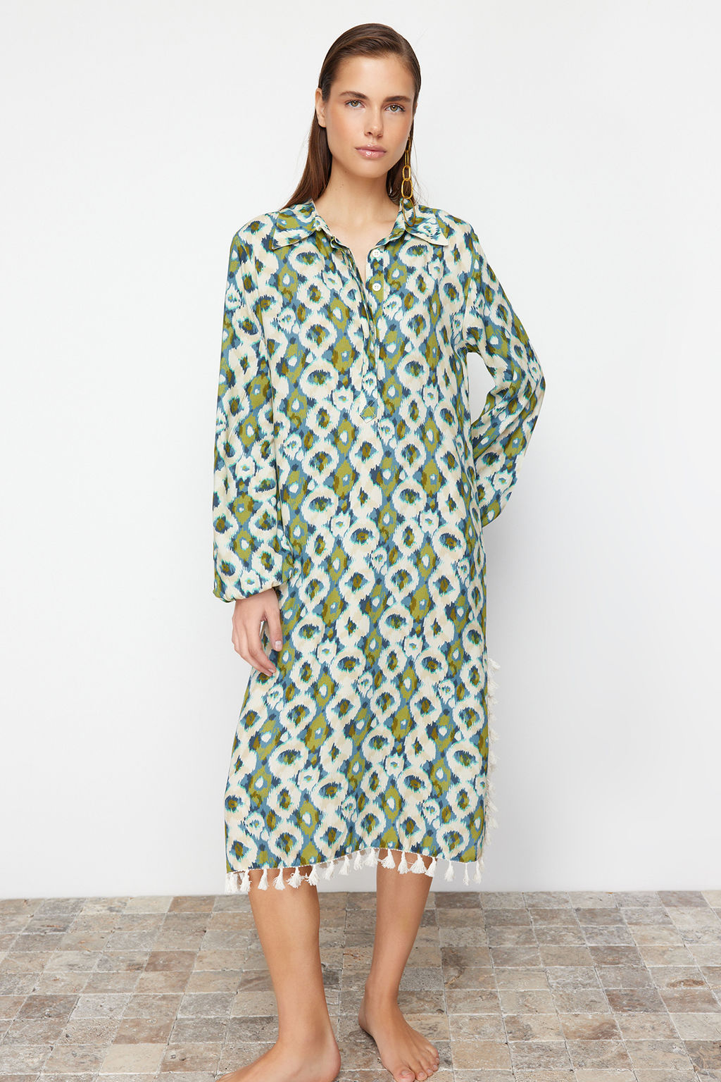 Geometrik Desenli Maxi Dokuma Puskullu Plaj Elbisesi TBESS24EL00105