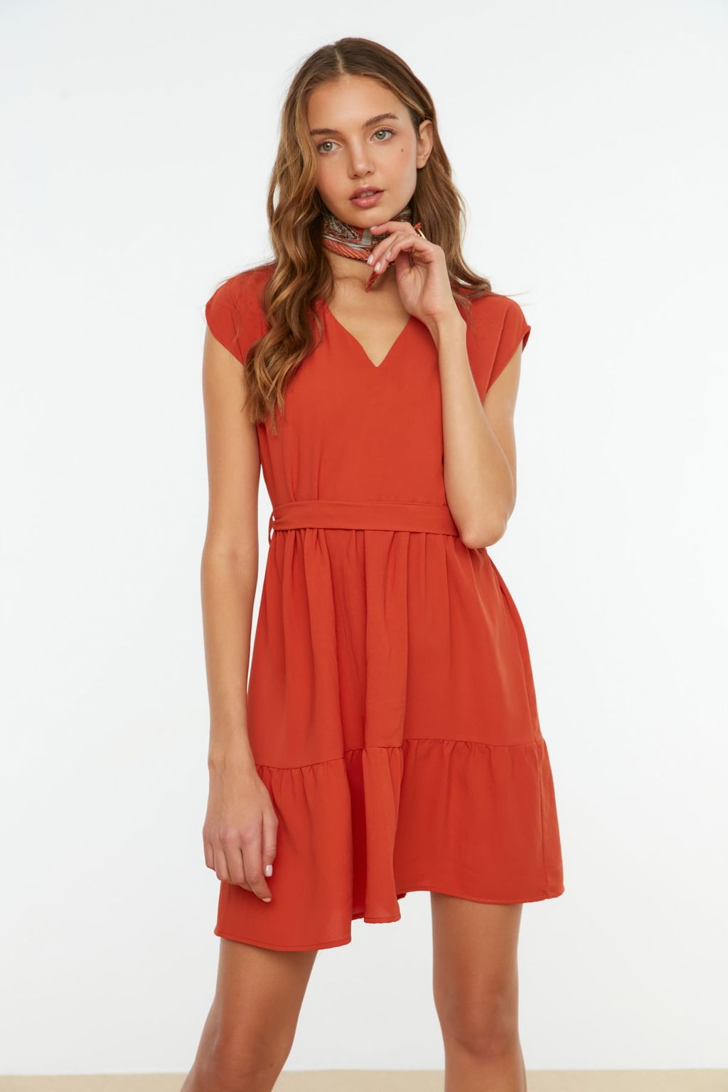 Kiremit Kusakl? Belden Ac?lan Mini Dokuma Elbise TWOSS20EL0628