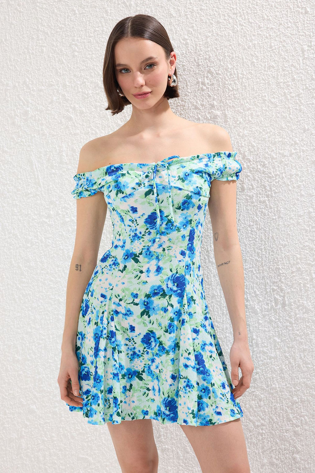 Mavi Carmen Yaka Skater/Belden Ac?lan Fitilli Esnek Mini Orme Elbise TWOSS25EL00472