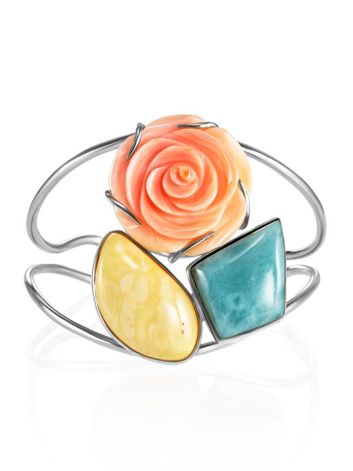Красивый эффектный браслет Розамунда с янтарём, бирюзой и стромбусом
