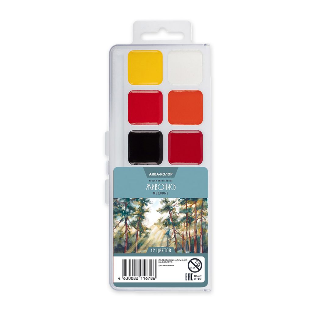 Краска акварель Аква-колор Живопись медовые, без кисти в пластиковой упаковке с европодвесом JIV-W12 12 цв
