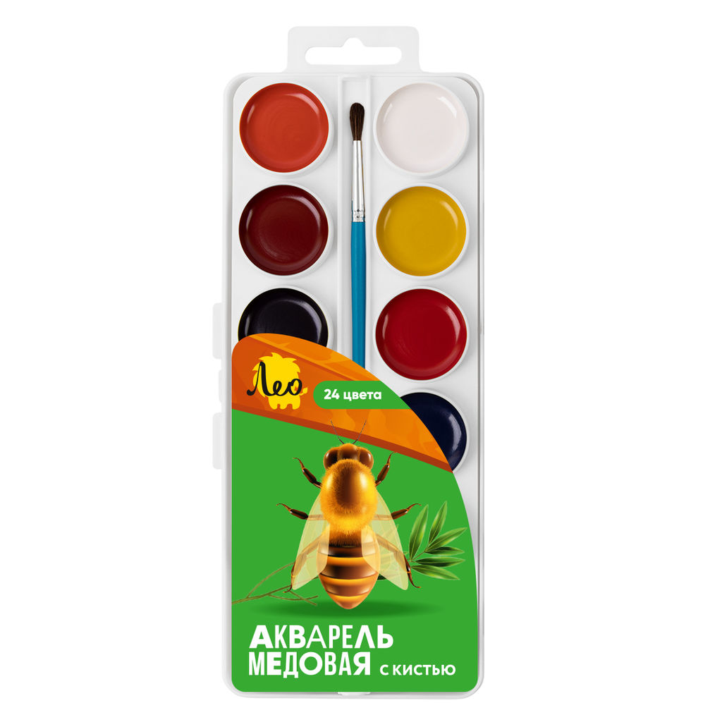 Краска акварель Лео Ярко медовые, с кистью (классическая двухъярусная) в пластиковой упаковке с европодвесом LBWB-0124 24 цв