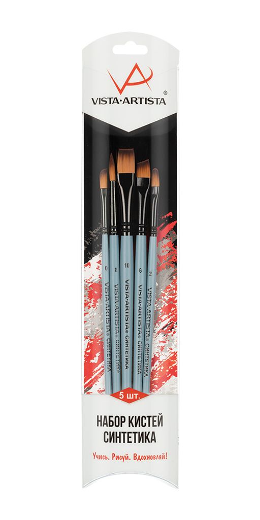 Набор кистей VISTA-ARTISTA синтетика VABS-03 5 шт. короткая ручка плоскоовальная скошенная №0, плоскоовальная №2, плоская скошенная №6, круглая №8, плоская №10