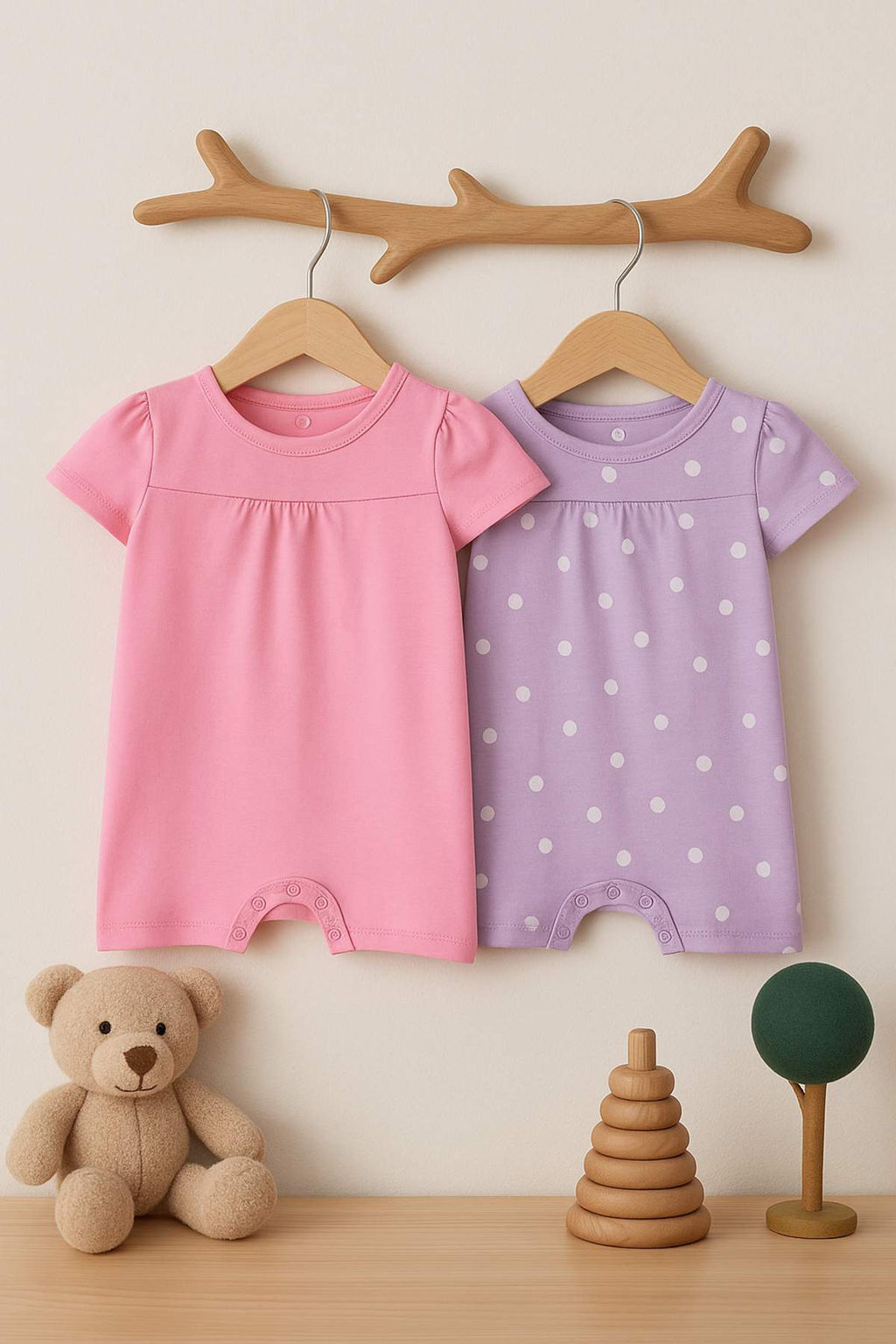 Lila-Pembe 2li K?z Bebek %100 Pamuk Puantiyeli K?sa Kol Orme Tulum TKDSS25TU00018