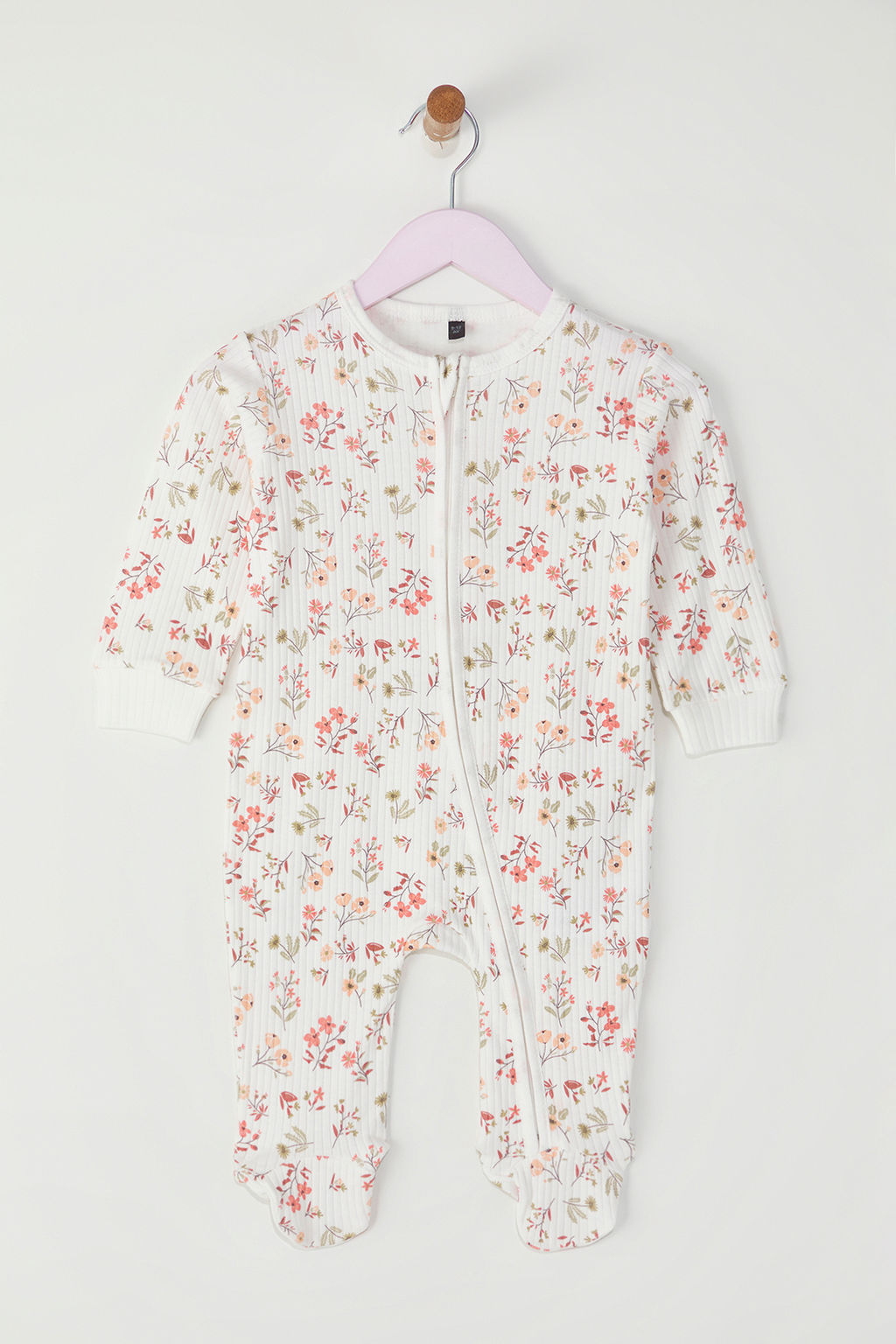 Ekru K?z Bebek %100 Pamuk Bask?l? Uzun Kol Orme Tulum TKDSS25TU00002