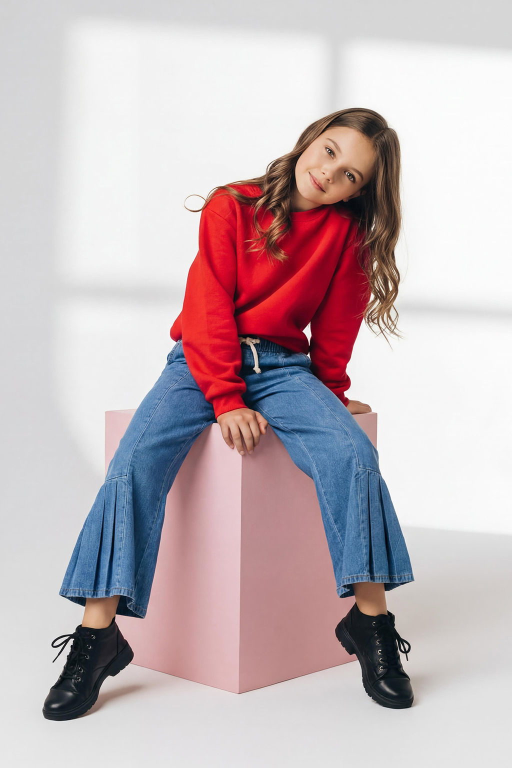 Ac?k Mavi K?z Cocuk %100 Pamuk F?rf?rl? Ispanyol Paca Lastikli Denim Pantolon TKDSS25PL00010