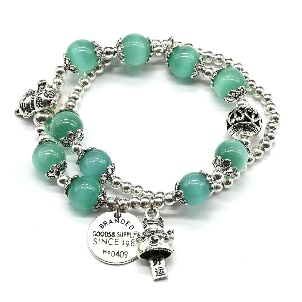 Двойной браслет из кошачьего глаза с подвеской шарик 8мм цв.мятный