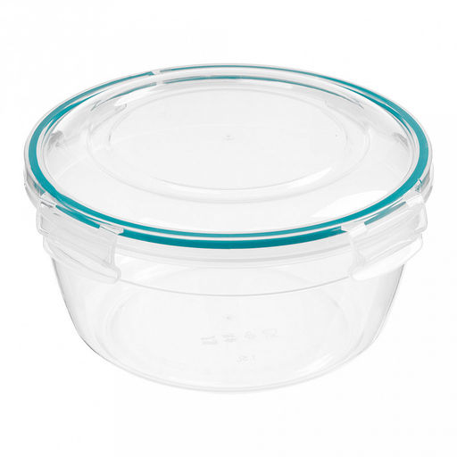 Контейнер для продуктов пластмассовый 0,86л, д15,3см, h8,5см, круглый, герметичный, ручки-клипса, прозрачный, с зеленой оконтовка (Россия)