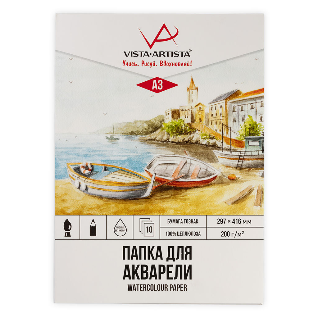 VISTA-ARTISTA PWG-A310 Папка с бумагой для акварели 100% целлюлоза 200 г/м2 A3 42 х 30 см папка 10 л. Лодочки гознак тисненая
