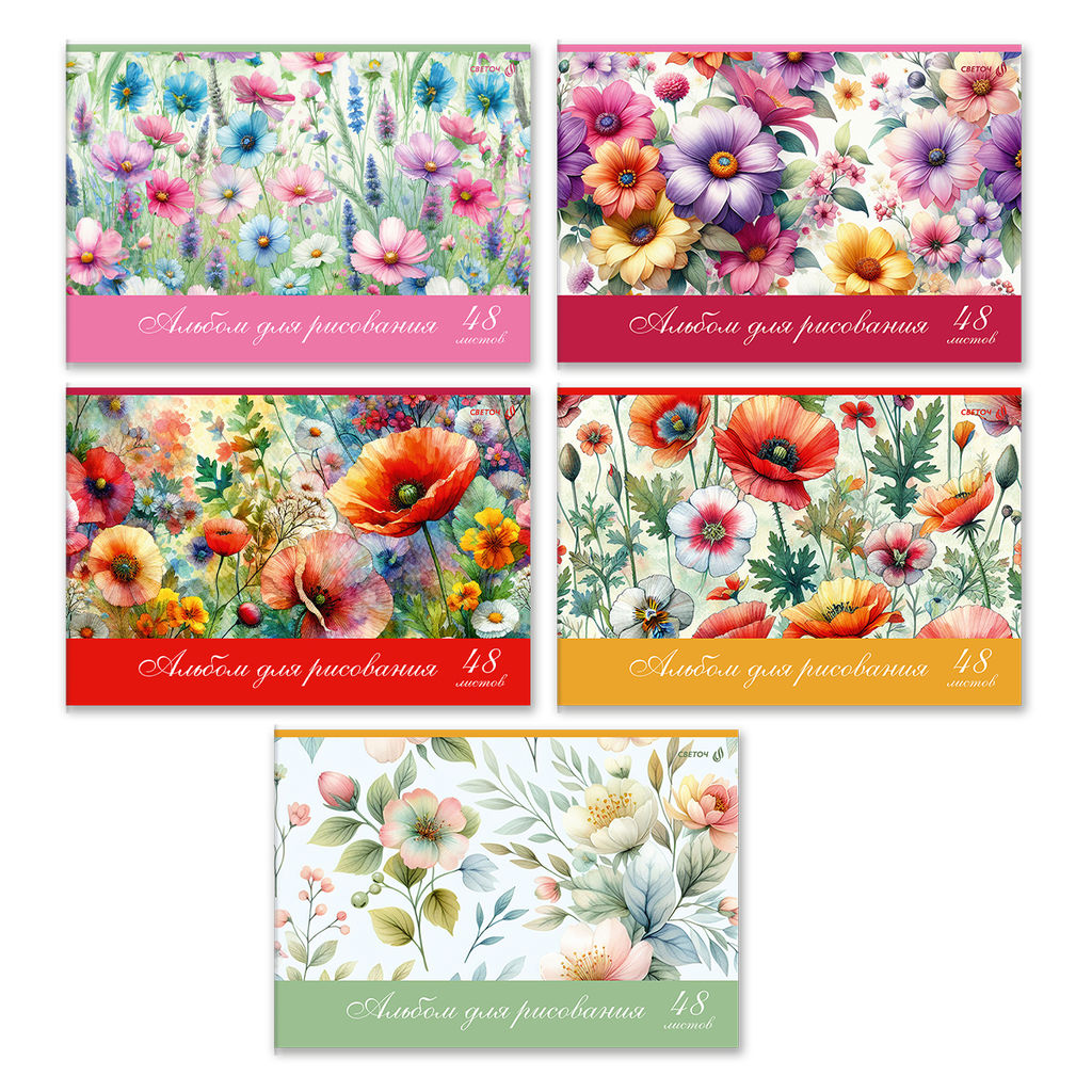 Светоч А260 Альбом для рисования, выбор.лак, 100 г/м2 A4 29.5 х 20.2 см 48 л. на скобе 5 шт. 01718 Полевые цветы