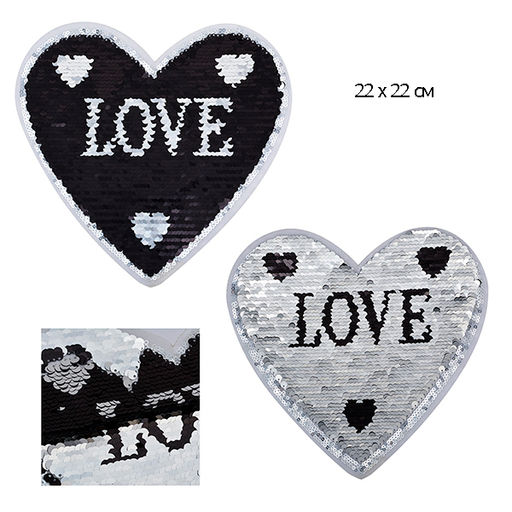 Аппликации пришивные арт.TBY.FLA04 СЕРДЦЕ LOVE с двусторонними пайетками 22х22см цв.черн/серебро уп.2 шт