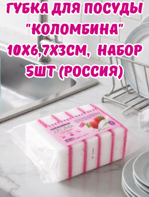Губка для посуды "Коломбина" 10х6,7х3см, поролон, абразивная фибра, арома - клубника, набор 5шт (Россия)