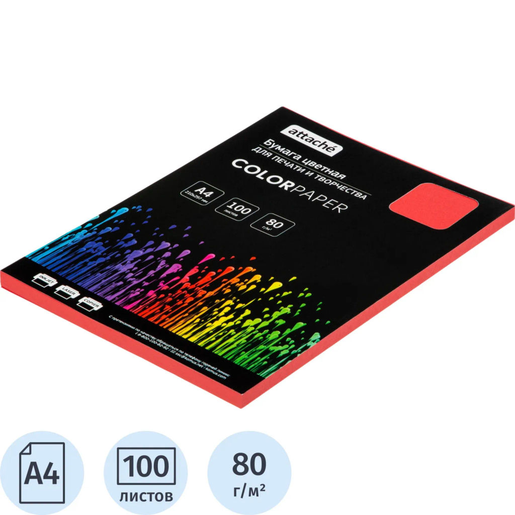 Бумага цветная Attache (красный интенсив), 80г, А4, 100 л