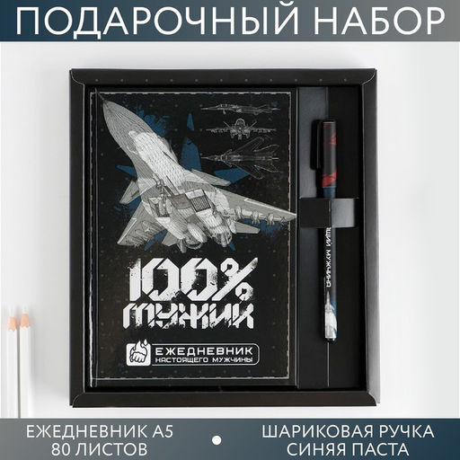 Подарочный набор 100% мужик, ежедневник А5, 80 л в твердой обложке и ручка