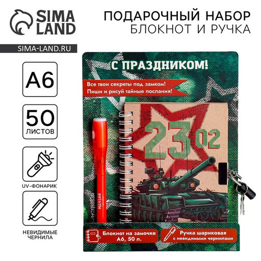 Подарочный набор 23 февраля, блокнот А6, 50 л и ручка шариковая с невидимыми чернилами